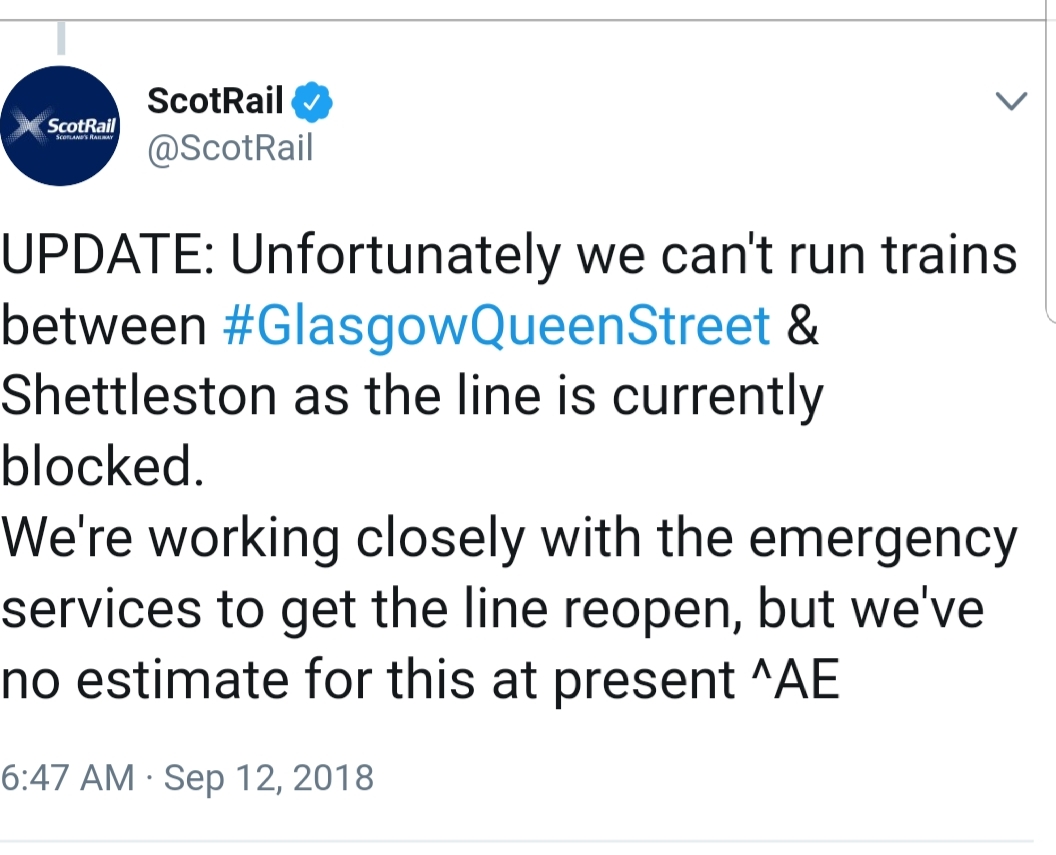 Published September 12, 2018 at 1056 × 855 in Train hits person near Queen Street Station in Glasgow, Services disrupted until noon ‹ Return to post Leave a comment Cancel reply Δ