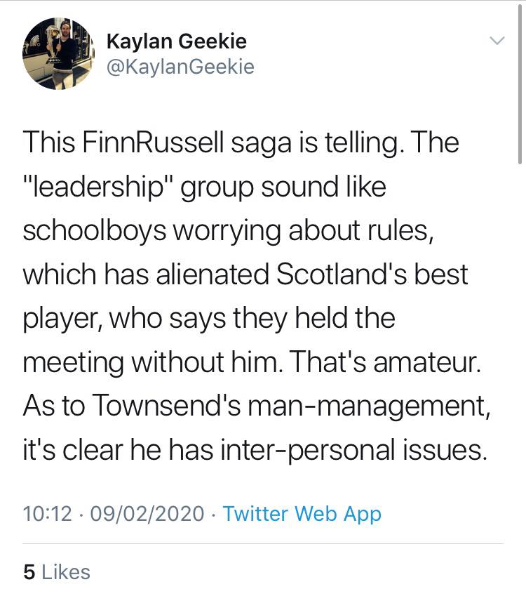 However, both Russell and the Scotland supporter pleas for a Scottish rugby revolution look unlikely to be implemented any time soon – with yesterday, Townsend in conversation with BBC’s Tom English, stating his refusal to give in to Russell’s demands.