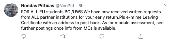 Nondas Pitticas, ERASMUS/Study Abroad Co-Ordinator at the University of the West of Scotland, shared information about the early return for EU students.