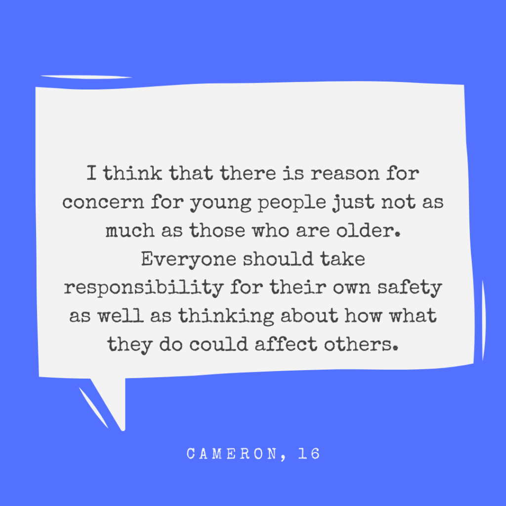 “Although older people are hardest hit, younger people are not spared. I have a message for young people: You are not invincible, this virus could put you in hospital for weeks or even kill you. Even if you don’t get sick the choices you make about where you go could be the difference between life and death for someone else.”