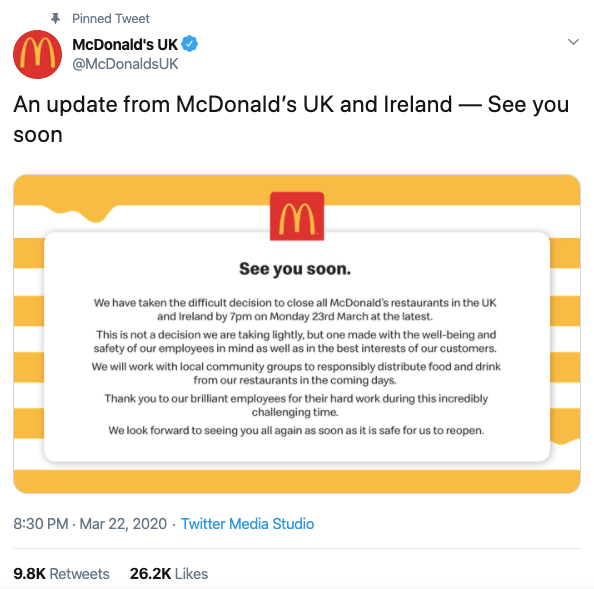 Food brands, restaurants, pubs and stores are closing due to the spread of the virus. Prime Minister, Boris Johnson, ordered the closure of pubs and restaurants in the UK last Friday.