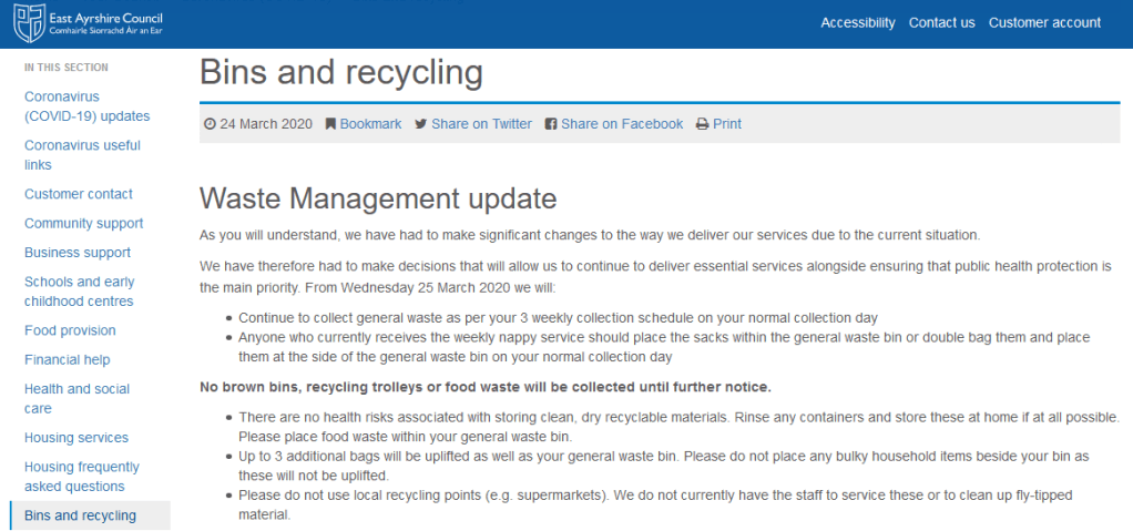 Currently all three Ayrshire councils have closed their Recycling Centres until further notice and have suspended the collection of garden waste.