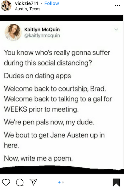 “For people who are used to being on apps to date,” continues Samantha, “another way to being in touch while battling this pandemic, is to have online dates or pick things up when we are able to return to the public sphere”.