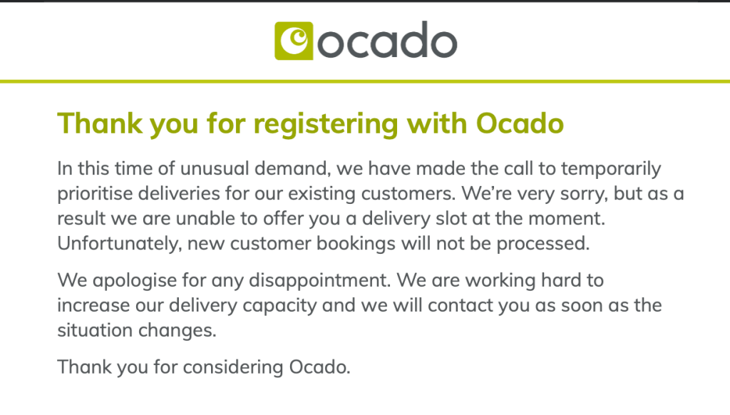 Even Ocado, the online supermarket, wasn’t prepared for the sudden increase in orders. While they are allowing new users to register, they aren’t allowing them to place orders. So if you weren’t an Ocado user before the pandemic, you won’t be able to use their services.