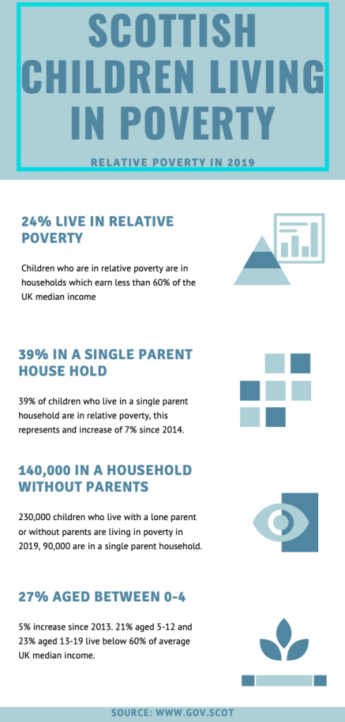 According to the Legatum almost 700,000 people have been plunged into poverty with 120,000 of those being children. With people on furlough schemes and job losses it is expected that people will be much worse off this year. The Scottish Government issued child poverty statistics at the beginning of the year for period 2018-2019.